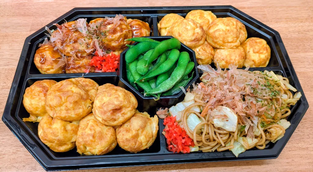 明石焼き、たこ焼き、柚子こしょう明石焼き、焼きそば、枝豆🫛